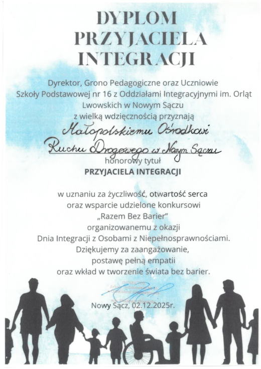 Małopolski Ośrodek Ruchu Drogowego w Nowym Sączu otrzymał wyróżnienie „Przyjaciel Integracji”, przyznanego za wspieranie rozwoju dzieci z niepełnosprawnościami. Wyróżnienie to traktujemy jako zobowiązanie do dalszego podejmowania działań na rzecz integracji, edukacji oraz budowania świadomości społecznej. Jest to również dowód na to, że realizowane przez nas projekty mają realne znaczenie dla rozwoju i bezpieczeństwa wszystkich uczestników ruchu drogowego – zwłaszcza tych najbardziej narażonych i wymagających szczególnej ochrony.